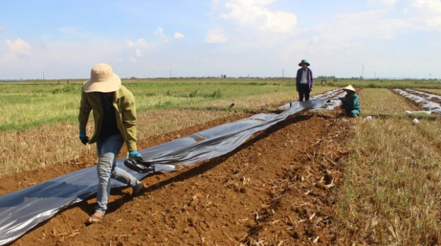Với màng phủ nông nghiệp, cần trải căng mặt luống, cố định chắc hai bên mép để tránh gió tốc. Sau đó đục lỗ trồng cây đúng khoảng cách, đảm bảo thoát nước tốt khi mưa lớn.