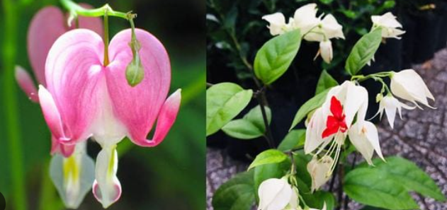 Hoa mọc thành chùm, rủ xuống, kích thước nhỏ, cánh mỏng và có dạng hình tim. Màu hoa phổ biến là hồng phấn, ngoài ra còn ghi nhận các dạng hoa màu trắng và đỏ nhạt. Khi hoa già và khô, cánh hoa tách đôi, tạo hình giống “trái tim vỡ”, đây cũng là đặc điểm giúp loài cây này dễ được nhận biết.