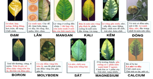 Thiếu đạm khiến cây sinh trưởng chậm, thân nhỏ, lá già vàng trước. Thiếu kali làm mép lá cháy xém, lá dễ quăn và cây giảm khả năng chống chịu. Thiếu magie gây vàng giữa gân lá trong khi gân vẫn xanh. Thiếu canxi và bo thường làm chết đỉnh sinh trưởng, hoa rụng nhiều, quả dễ méo và nứt.
